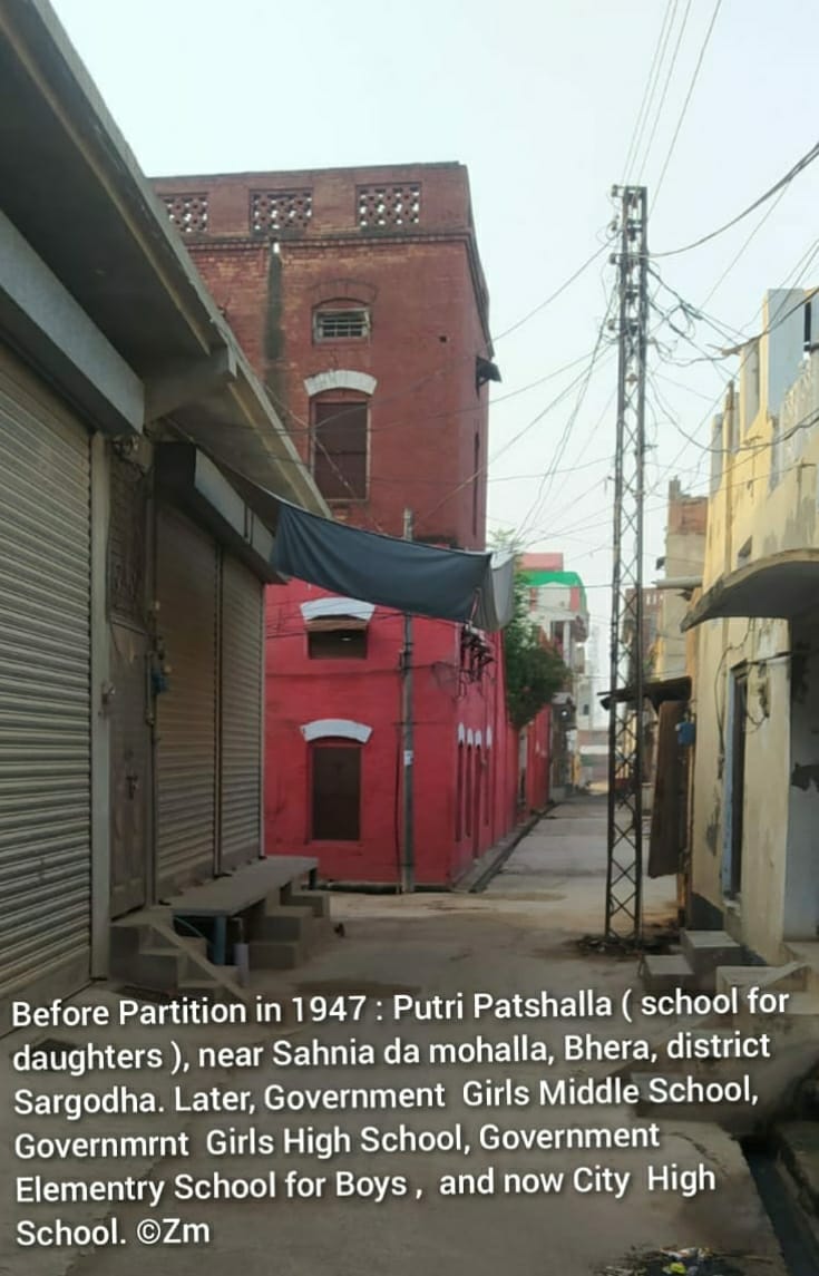 Girls Middle School ( known as Putri Patshalla), was near Ganj Mandi, Sahnia da mohalla, before 1947 . In early 1950s , it was upgraded to Government Girls High School. Around late 1980s , the Girls High School was shifted to the new building of old Arya High School . In the vacated building Middle School for Boys was shifted from Arya School . It was named as Government Elementary School ( Grade I to VIII) . It has lately been upgraded and named, ” City Government High School, Bhera “.