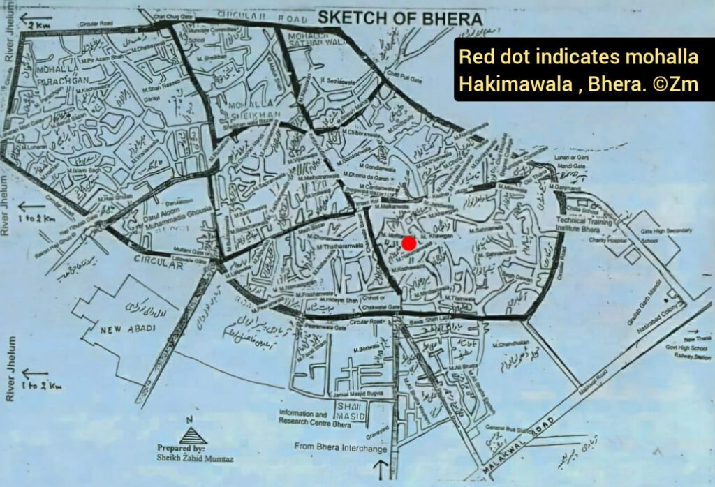 In the north of Hakimawala is Mohalla Muftianwala, Qazianwala ( one of the oldest mohallas of Bhera) , and the road coming from Ganjwala Dawaza ( Lahori Gate – 1865) to Imam Kote ( old Gurdwara ). In the west is Chakwala bazaar, in the south mohalla Kachaweara and Khawajgan ( one of the biggest mohallas of Bhera), and in the east also Khawajgan.