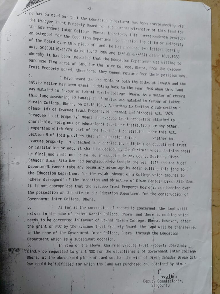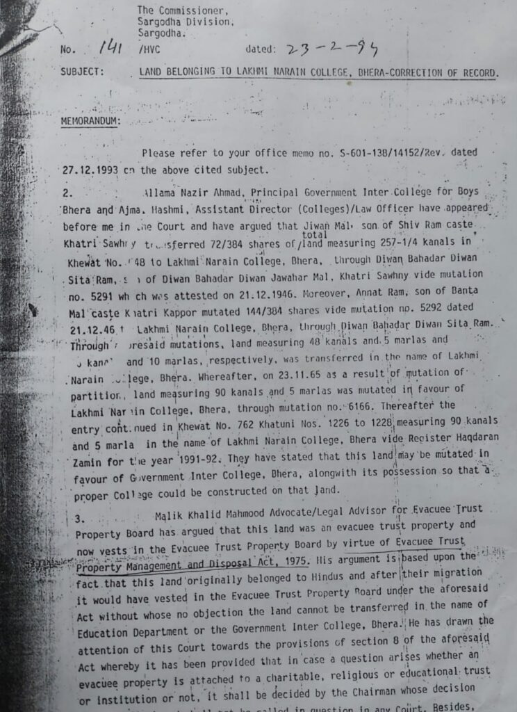 · “I have heard the arguments of both sides at length and the entire matter has been examined dating back to the year 1946 when this land was mutated in the favour of Lakhmi Narian Collage Bhera. As a matter of record, this land measuring 90 kanals and five marlas was mutated in favour of Lakhmi Narian College Bhera”.