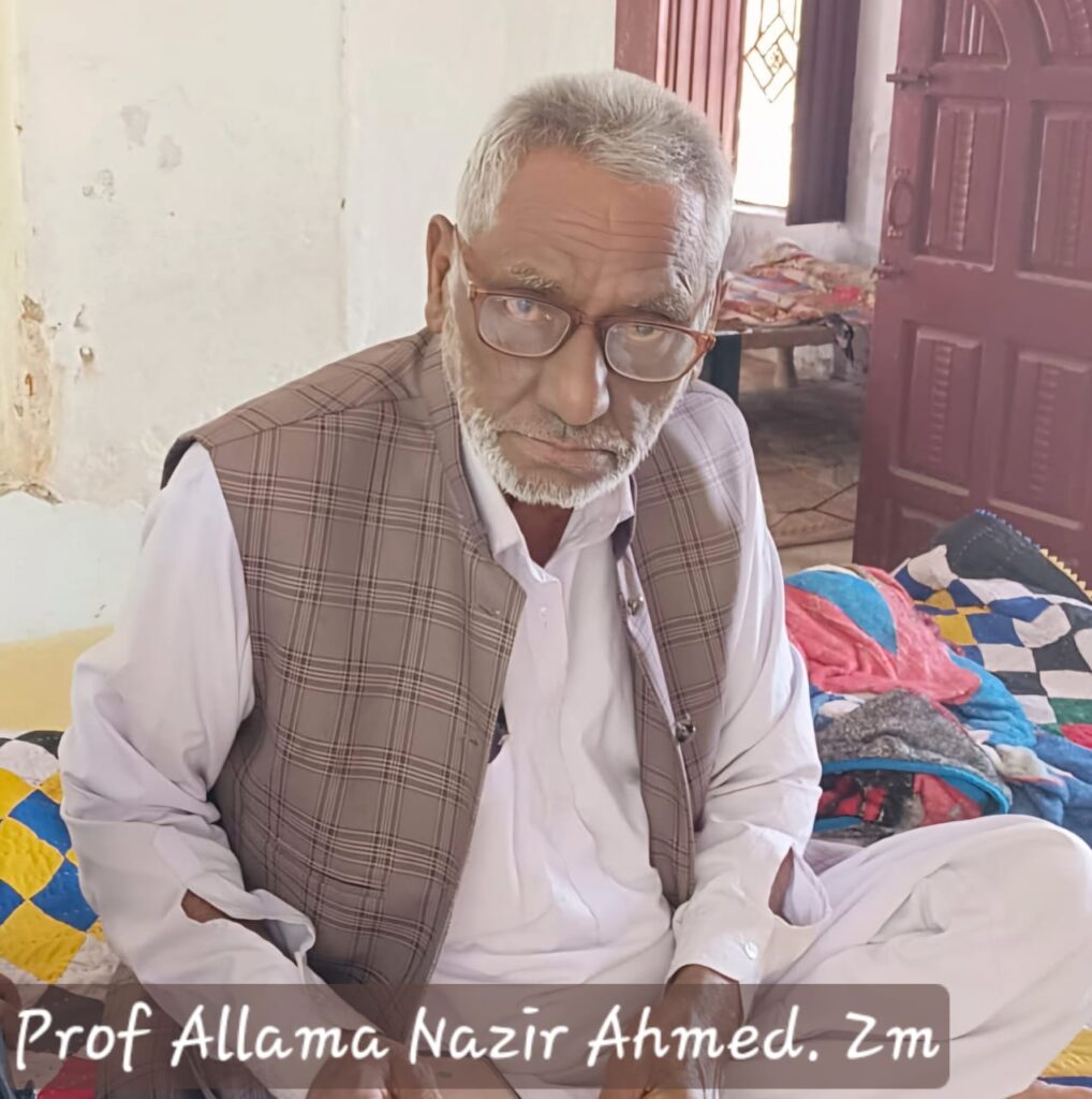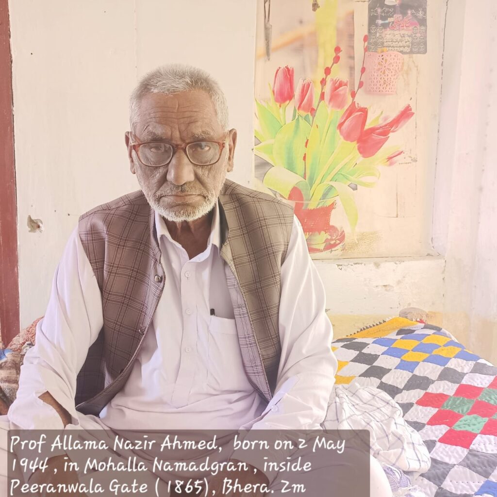 Prof Allama Nazir Ahmed was born on 2 May 1944 in Mohalla Namadgran ( inside Peeranwala Darwaza – 1865), Bhera, district Sargodha. He has the honour of delivering the first lecture at Government Intermediate College, Bhera, on 9 September 1978. Prof Allama Nazir Ahmed, son of Ghulam Ahmed, started his primary education in 1949 at Anjumn Islamia Primary School, Bhera. Did matric in 1961, JV ( 1963), FA ( 1965), BA (1967), MA English ( 1969). Became lecturer in 1976, and served at various collages. He has the honour of delivering the first lecture at Government Inter Colege, Bhera, on 9 September 1978. He was posted as principal at the same college in 1993 for a year and in November 2002, appointed assistant professor at Sargodha University. He remained associated with education for many years after his retirement. Allama Sahib courageously and with dedication fought the case for establishing Behra Degree College, Bhera, on the donated land by Lakhmi Narayan before the Independence in 1947. Prof Nazir Ahmed is an honest, hardworking, and straightforward person. He is an avid reader with liberal views and has ample knowledge of Bhera’s history and cultural heritage. He has a photographic memory, is a good storyteller, must write his memoirs of Bhera or get them recorded in audio or video format. Part 1 of his memoirs of Bhera is given below in audio format, also in written form. To be continued … . Zahid Mumtaz