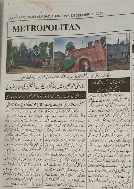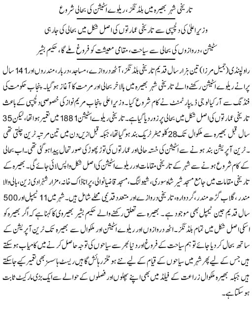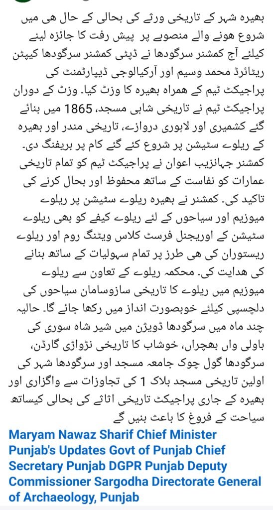 الحمدللّہ تاریخی شہر بھیرہ میں پنجاب آرکیالوجی ڈیپارٹمنٹ کی طرف سے شہر بھیرہ کے مختلف تاریخی مقامات پر کام تیزی سے جاری وساری ہےجس میں جامع مسجد شیر شاہ سوری،بھیرہ کے تاریخی دروازے،ریلوے اسٹیشن،باؤلی والا مندر شامل ہیں یہ پروجیکٹ تقریباً دو سال میں مکمل ہو گا سارے پروجیکٹ کی پوری وڈیو جلد اپلوڈ کروں گا