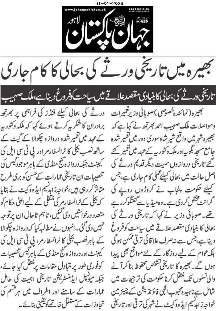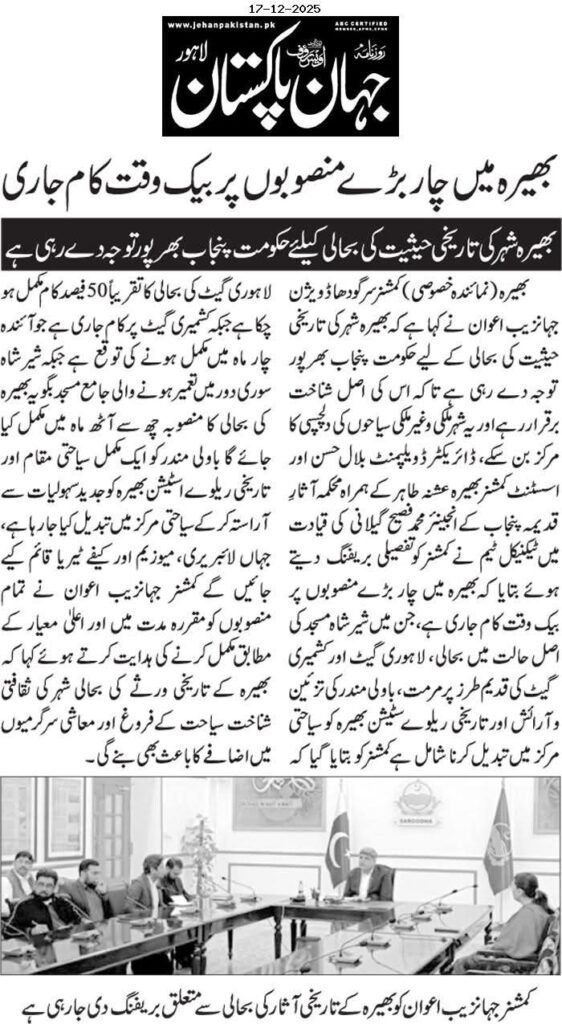 ڈپٹی کمشنر نے بھیرہ میں جاری وال سٹی پراجیکٹ کے تحت تاریخی عمارات کی بحالی اور تزئین و آرائش کے کاموں کا موقع پر جا کر جائزہ لیا۔ متعلقہ افسران نے پیش رفت پر بریفنگ دی۔ ڈپٹی کمشنر نے ہدایت کی کہ تاریخی عمارات کی اصل شناخت اور ثقافتی اہمیت کو برقرار رکھتے ہوئے کام مکمل کیا جائے اور منصوبے کی بروقت تکمیل یقینی بنائی جائے۔