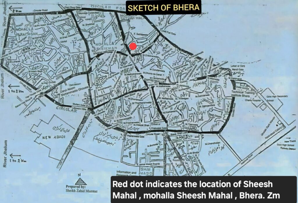 Mohalla Sheesh Mahal is a middle-sized mohalla in Bhera. In the east, it is mohalla Chitti Pully and Jethuwali Khui , in the north Sethianwala _Kalan_, in the west mohalla Kapooran, Sheikhanwala and bazaar Dalgaran and the south Masjid Haji Meharban and mohalla Gadianwala , in the southeast mohalla Chibberanwala .