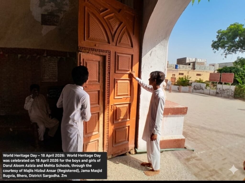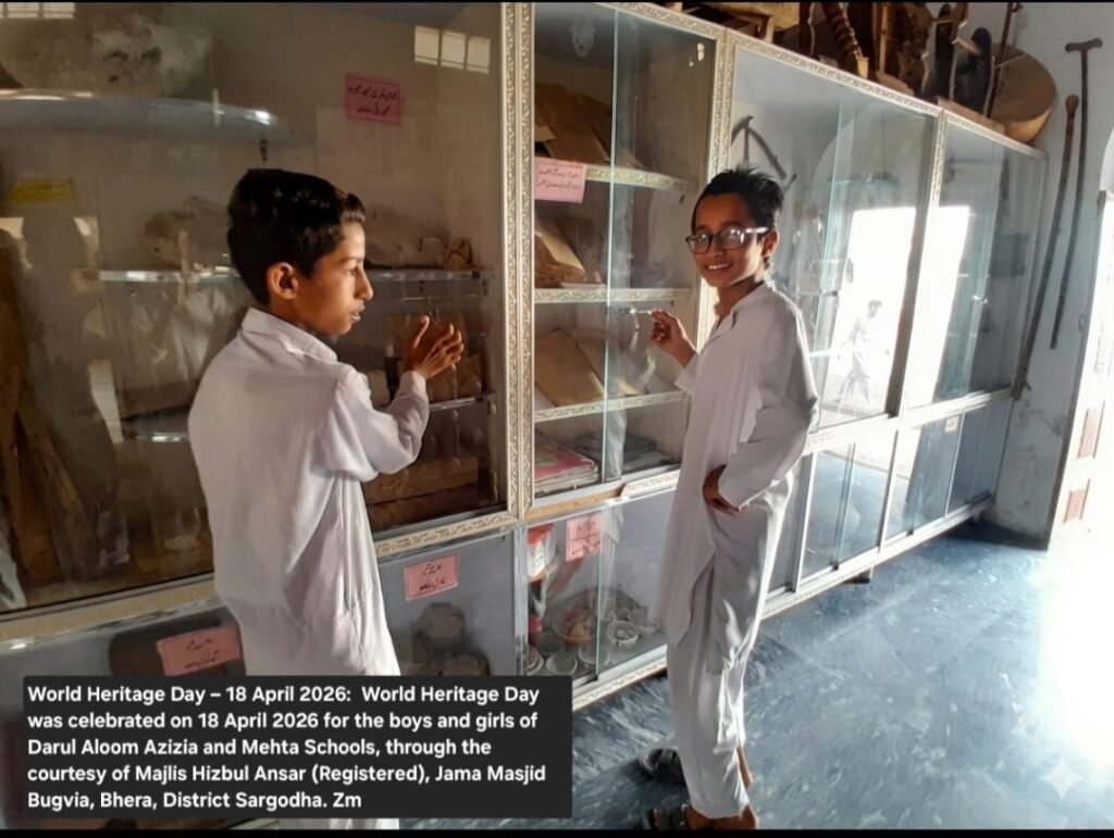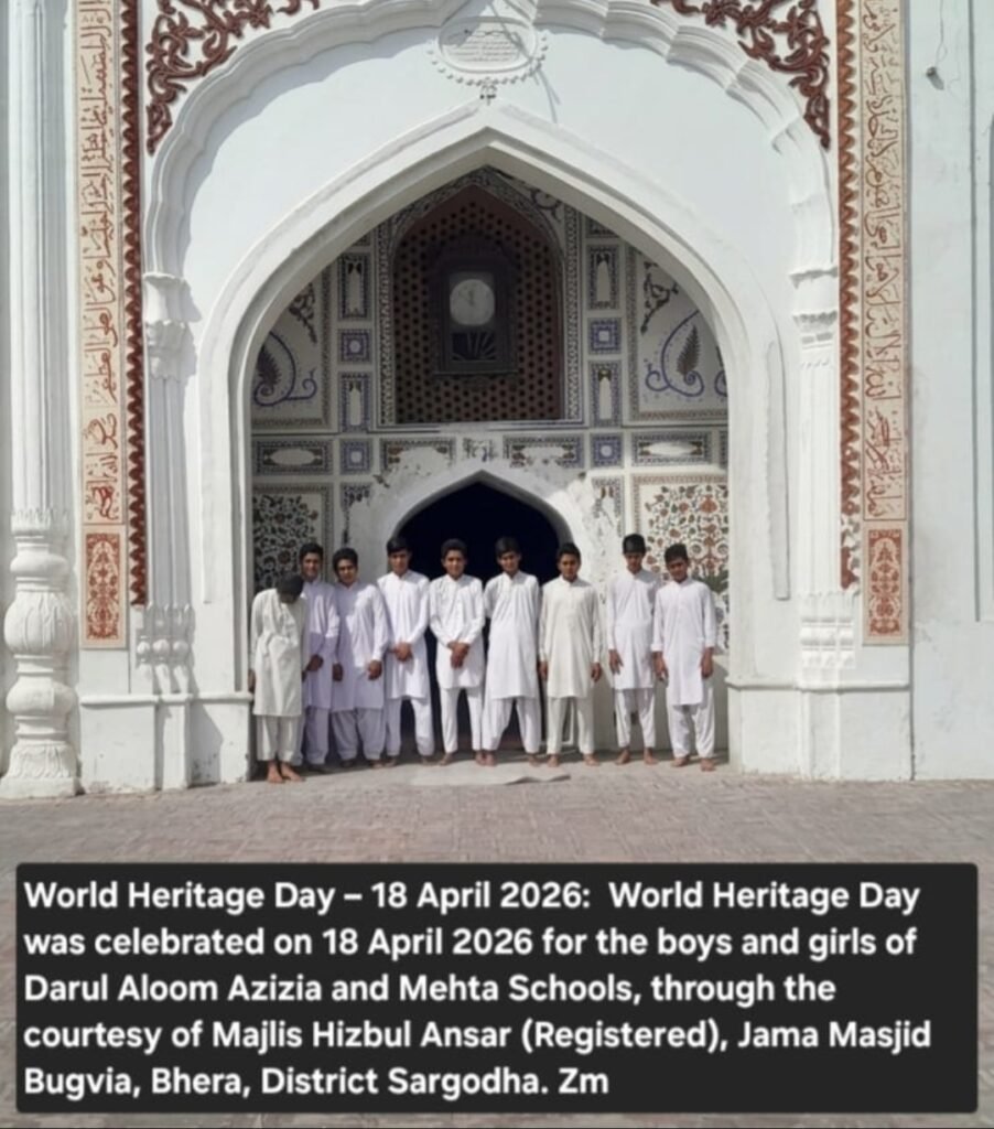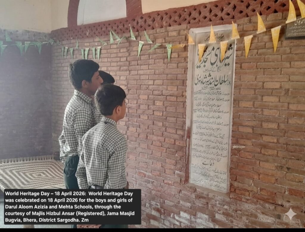 World Heritage Day was celebrated on 18 April 2026 for the boys and girls of Darul Aloom Azizia and Mehta Schools, through the courtesy of Majlis Hizbul Ansar (Registered), Jama Masjid Bugvia, Bhera, District Sargodha. See on the website bhera.org: under the category , Miscellaneous.The link is given below : https://bhera.org/world-heritage-day-was-celebrated-on-18-april-2026-for-the-boys-and-girls-of-darul-aloom-azizia-and-mehta-schools-through-the-courtesy-of-majlis-hizbul-ansar-registered-jama-masjid-bugvia-bhera/   Zahid